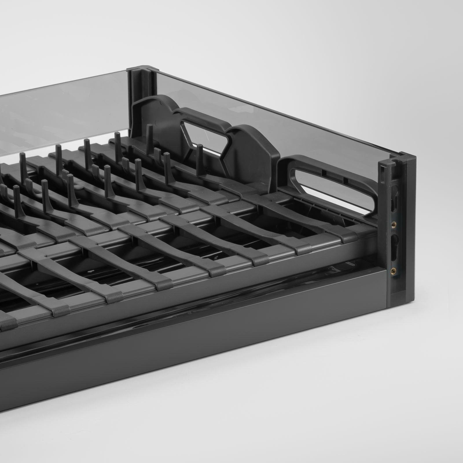 Features smooth pull-out trays shaped like a peanut for maximum accessibility and space use.